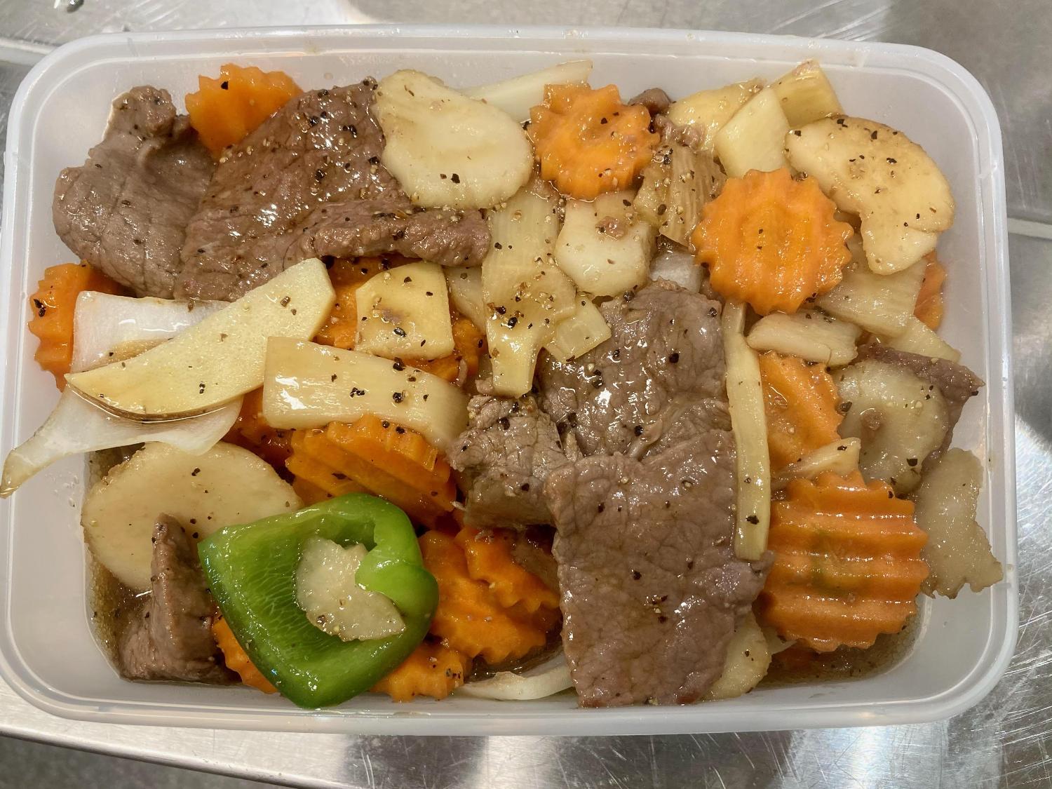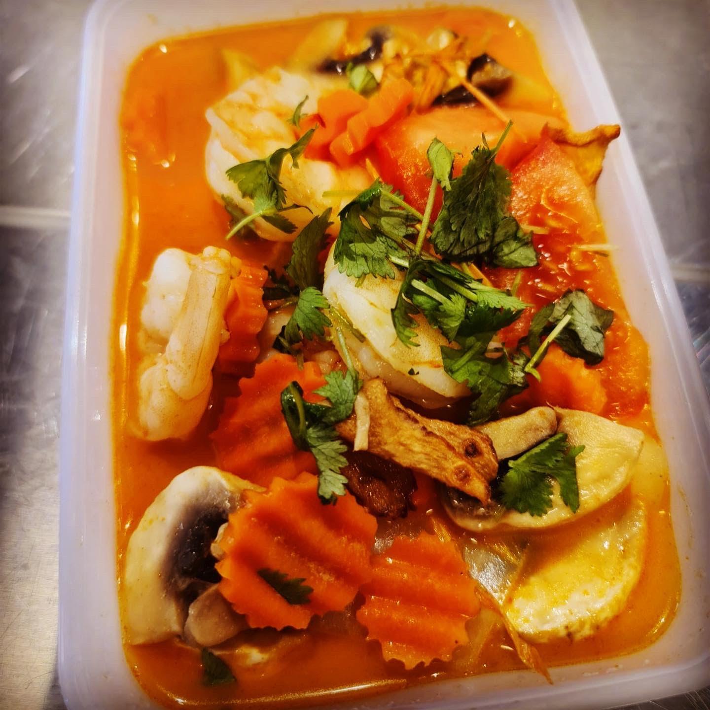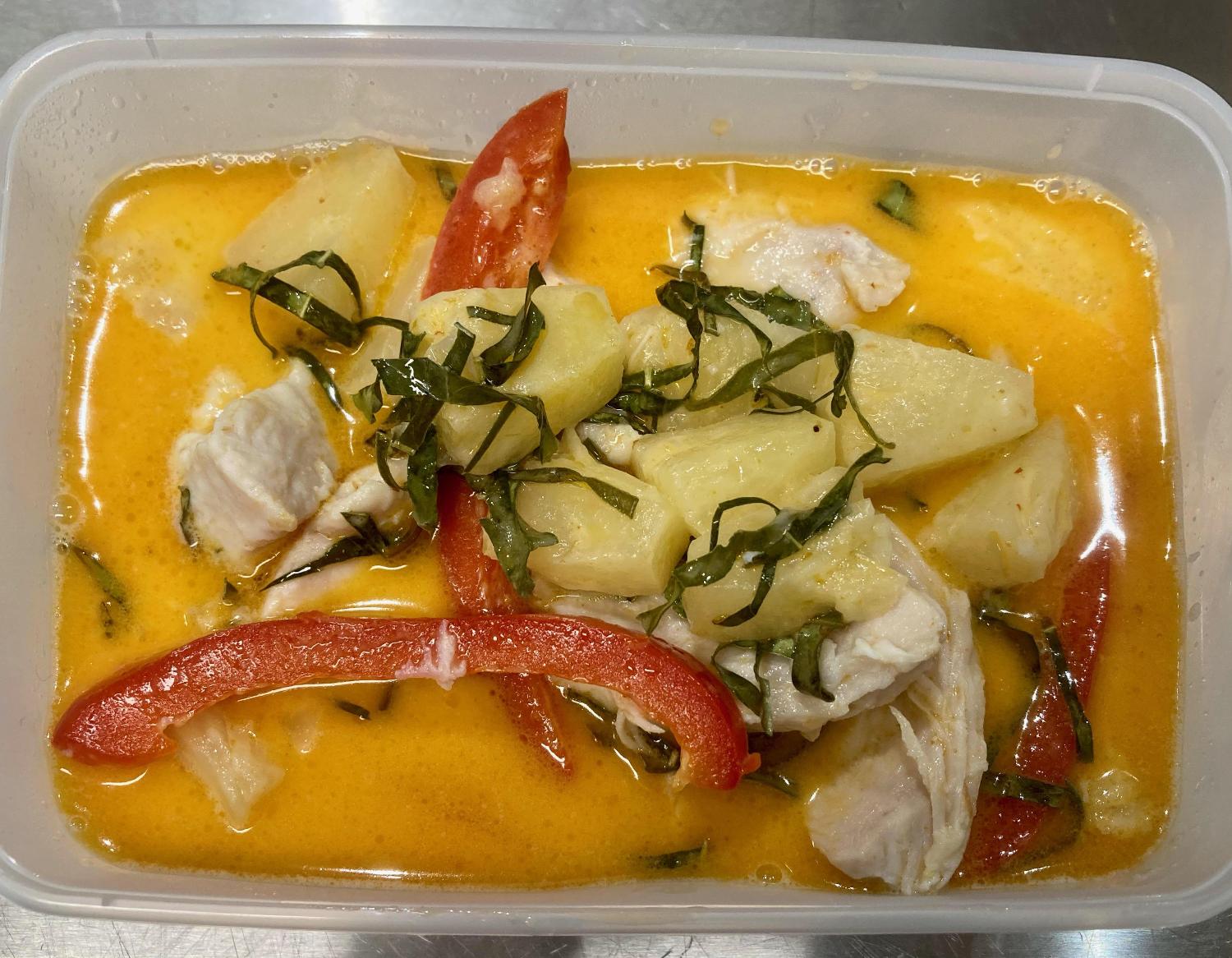 Rød karrirett med kokosmelk, basilikum, bambusskuddog rød paprika.Serveres med jasminris.